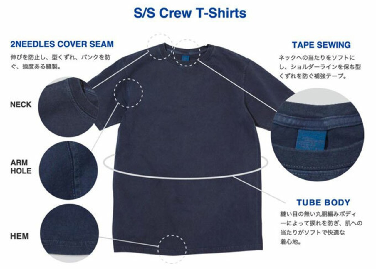 素材には肌に優しく強度にも優れた高品質のアメリカ綿を使用。長年の着用に耐えうる縫製、最も縮んだ状態から着用によって生地が馴染んだときにベストなサイズスペックとなるように、後染めによる縮率を計算した独自のパターン。胴周りに縫い目の無い丸胴編みのボディーは肌触りが良く丈夫で、見た目も極めてシンプル。