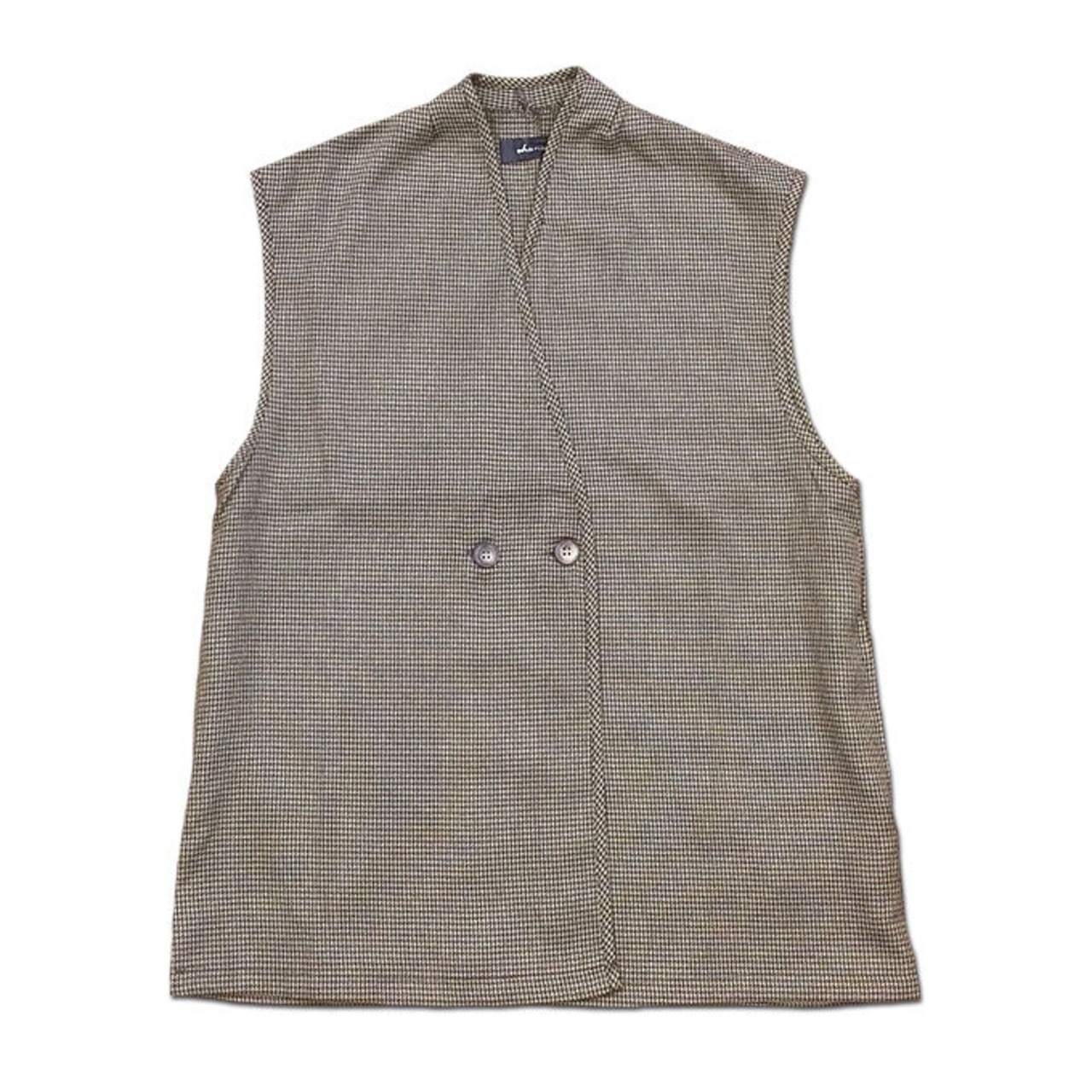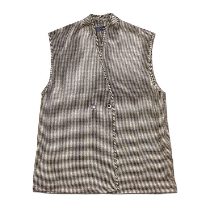細かい千鳥格子柄が特徴的なゆったりしたシルエットのジレ。 シャツやカットソーといった普段使うアイテムにさっと羽織る だけで大人っぽい上品なコーディネートができます。 ワイドパンツやスカートとの相性は抜群でおすすめ。 前を開けてラフな感じに着るとカジュアルな雰囲気にもなります。
